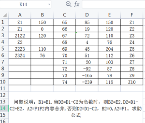 问题说明:B1=E1,当D2=D1-C2为负数时,则B2=E2,D2=D1-C2+E2,A2=F1F2内容合并,否则D2=D1-C2,B2=0,A2=F1。求助A2、B2下拉公式