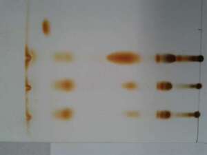 这是我做薄层跑油脂三酰甘油时候的图片,前面的点跑的还行跑到后面的时候就开始粘连了的感觉,就感觉没跑出三酰甘油的感觉,但是有一次又跑出来了。注:最右边是标样三酰甘油。