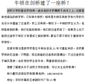 剑桥大学的皇后学院有一座古老的木桥横跨于剑河之上,这就是举世闻名的数学桥,又叫做牛顿桥相传是牛顿采用数学和力学的方法设计并建造了这座桥,桥上没有用一颗钉子。牛顿的学生认为:老师能做到的事,他们也能够做到。他们把这座桥拆了,结果怎么也不能把这座桥不用钉子恢复成之前的原样,最后不得不用钉子重新将木桥架好.