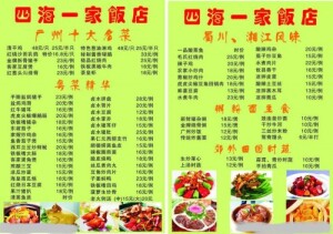 四海一家饭店 广州十大名菜 客家豆腐煲16元/例铁板黑椒牛肉18元/例 红葱头焗排骨23元茶皇虾18元/例 粤菜精华 手撕盐焗猪手23元/例卤水拼盘28元/例 盐焗鸡肾20元/例卤水肾片20元/例 红牛猪耳16元/例卤水豆腐12元/例 虎皮尖椒爆鹅肠20元/例卤水掌亦15元/例 等等。。。。。。